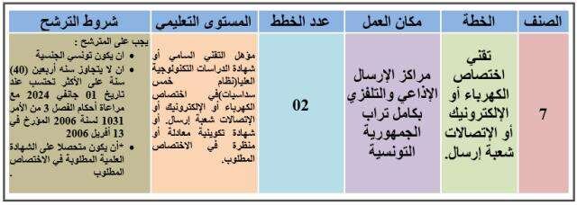 للعمل بمراكز الإرسال الإذاعي والتلفزي، اختصاص الكهرباء أو الإلكترونيك أو الاتصالات شعبة إرسال.