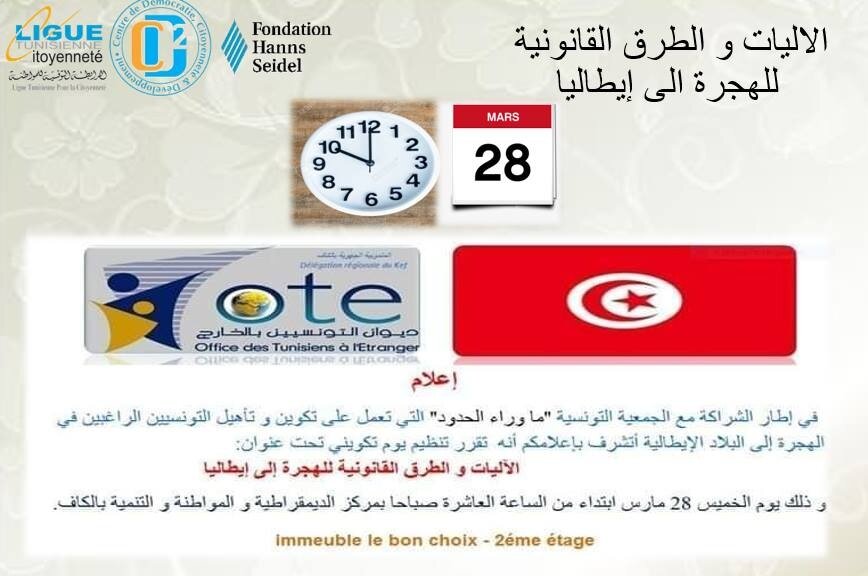 في إطار الشراكة مع الجمعية التونسية » ما وراء الحدود » التي تعمل على تكوين وتأهيل التونسيين الراغبين في الهجرة إلى البلاد الإيطالية أتشرف بإعلامكم أنه تقرر تنظيم يوم تكويني تحت عنوان: