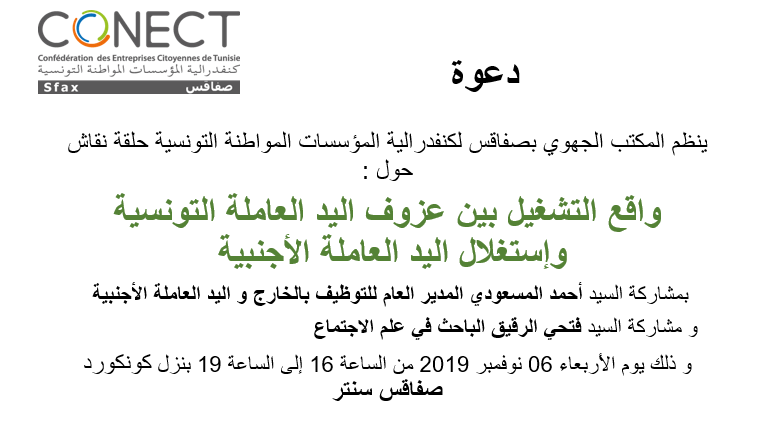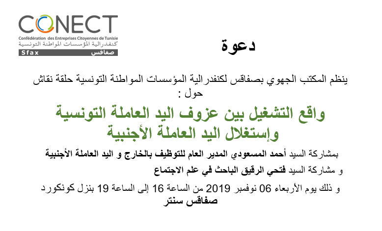 و ذلك يوم الإربعاء 06 نوفمبر 2019 من الساعة 16 إلى الساعة 19 بنزل كونكورد صفاقس سنتر.
