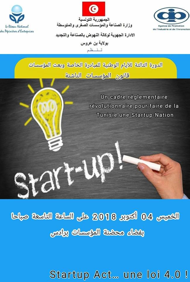 يشرفني اعلامكم أن وكالة النهوض بالصناعة والتجديد ببن عروس تعتزم تنظيم الدورة الثالثة للأيام الوطنية للمبادرة الخاصة وبعث المؤسسات بفضاء محضنة المؤسسات برادس وذلك يوم الخميس 04 أكتوبر2018 على الساعة التاسعة صباحا والتي سيكون محورها الرئيسي حول قانون المؤسسات الناشئة « STARTUP ACT ».