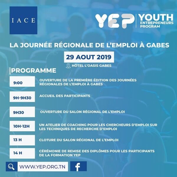 برنامج عمل اليوم الجهوي للتشغيل بقابس الذي ينظمه المعهد العربي لرؤوساء المؤسسات في إطار برنامج YEP بالشراكة مع UTICA والإدارة الجهوية للتشغيل.. كونوا في الموعد يوم الخميس 29 أوت 2019..