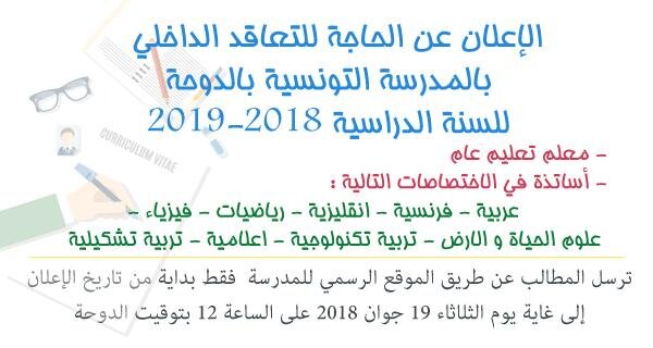 | تعلن المدرسة التونسية بالدوحة عن حاجتها لإنتداب (داخلي) عدد من المدرسين للسنة الدراسية 2018-2019 في الاختصاصات التالية : |