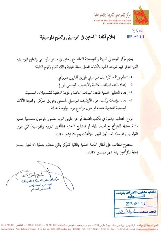 انتداب : بالمركز الموسيقى العربية والمتوسطية Annonces S’abonner à notre NEWSLETTER Recevoir tous les offres d'emploi ✅ Regarder la chaine à Recruter.TV اعلام لكافة الباحثين في الموسيقى و العلوم الموسيقية يعتزم مركز الموسيقى العربية والمتوسطية التعاقد مع باحثين في ميدان الموسيقى والعلوم الموسيقية الذين تتوفر فيهم شروط الخبرة والكفاءة للعمل بصفة ظرفية S’abonner à notre NEWSLETTER Recevoir tous les offres d'emploi ✅ Regarder la chaine à Recruter.TV S’abonner à notre NEWSLETTER Recevoir tous les offres d'emploi ✅ Regarder la chaine à Recruter.TV Partager : Cliquez pour partager sur Facebook(ouvre dans une nouvelle fenêtre) Facebook Cliquez pour partager sur LinkedIn(ouvre dans une nouvelle fenêtre) LinkedIn Plus Cliquer pour partager sur X(ouvre dans une nouvelle fenêtre) X Cliquer pour envoyer un lien par e-mail à un ami(ouvre dans une nouvelle fenêtre) E-mail Cliquez pour partager sur WhatsApp(ouvre dans une nouvelle fenêtre) WhatsApp Facebook