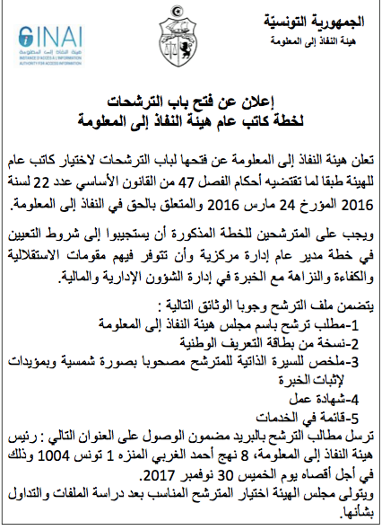 تعلن ھیئة النفاذ إلى المعلومة عن فتحھا لباب الترشحات لاختیار كاتب عام .