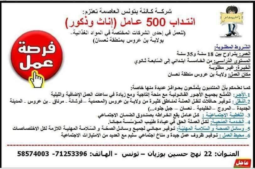 انتداب لـ 500 عامل لكلا الجنسين (ذكور وإناث)