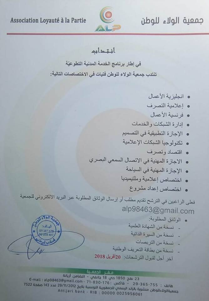 تنتدب جمعية الولاء للوطن فتيات في الاختصاصات التالية: