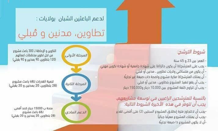 انطلق بداية من يوم الإثنين، 06 نوفمبر 2017، عملية قبول الترشحات لبرنامج رائد بولايات تطاوين، مدنين و قبلي لدعم 300 باعث وباعثة مشروع وهو برنامج أطلقته منظمة “مهارات للنّجاح” بالتّعاون مع وزارة التكوين المهني والتشغيل بهدف المساهمة في تمويل المؤسسات الصغرى من خلال اسناد منحة تمويل بقيمة 15 ألف دينار لكل مشروع بالاضافة الى تنظيم دورات تكوينية في مجال المبادرة الخاصة بالتنسيق مع المصالح الجهوية للتكوين المهني والتشغيل