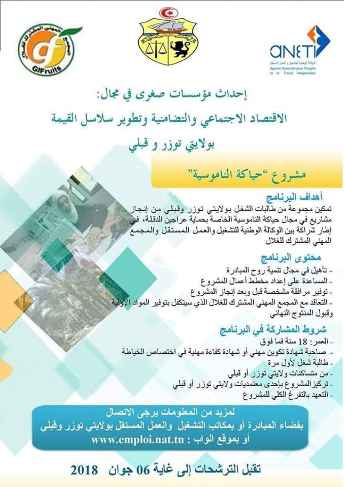 لكل شابة باحثة عن شغل وترغب في بعث مشروع لحسابها الخاص، يتجاوز سنها 18 سنة ومتحصلة على شهادة تكوين مهني أو شهادة كفاءة مهنية في مجال الخياطة أن تتقدم بمطلب ترشح إلى مكاتب التشغيل وفضاءات المبادرة بولايتي توزر وقبلي في أجل أقصاه يوم الاربعاء 06 جوان 2018،ملاحظة: لا يمكن قبول المترشحات اللاتي فاقت فترة إنخراطهن بالصندوق الوطني للضمان الإجتماعي 24 شهرا بصفة مسترسلة أو 36 شهرا بصفة متقطعة.
