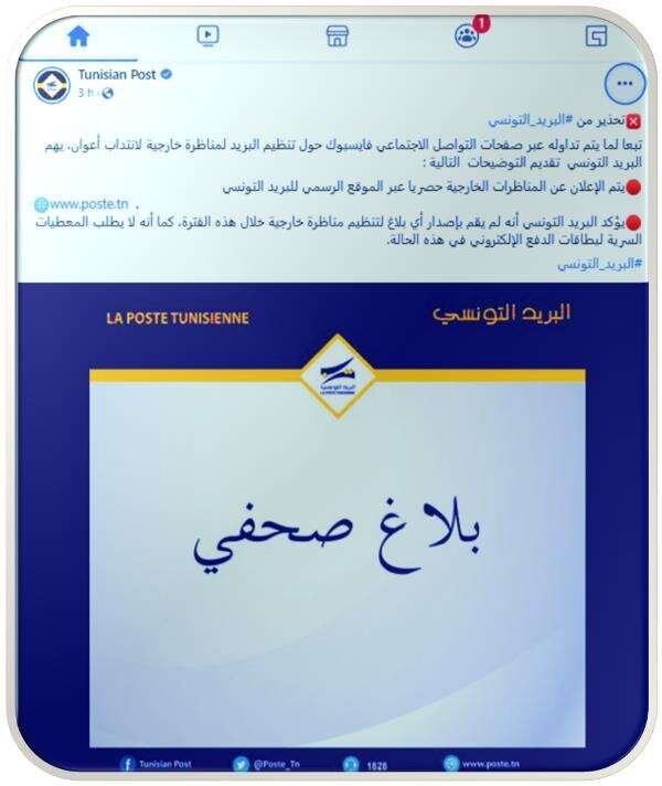 يؤكد البريد التونسي أنه لم يقم بإصدار أي بلاغ لتنظيم مناظرة خارجية خلال هذه الفترة، كما أنه لا يطلب المعطيات السرية لبطاقات الدفع الإلكتروني في هذه الحالة. S’abonner à notre NEWSLETTER Recevoir tous les offres d'emploi ✅ Regarder la chaine à Recruter.TV