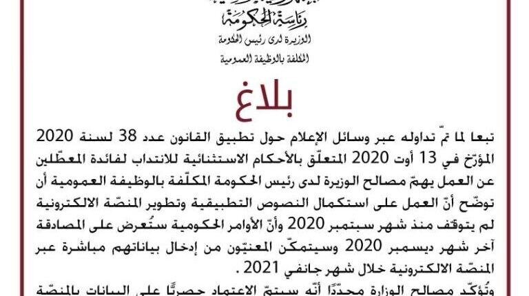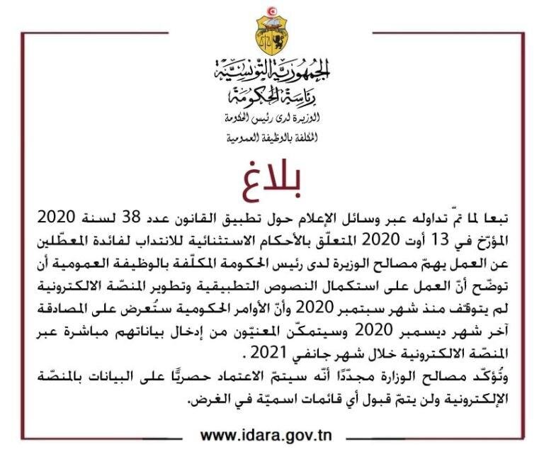 تبعا لما تم تداوله عبر وسائل الإعلام حول تطبيق القانون عدد 38 لسنة 2020 المؤرخ في 13 أوت 2020 المتعلق بالأحكام الاستثنائية للانتداب لفائدة المعطلين
