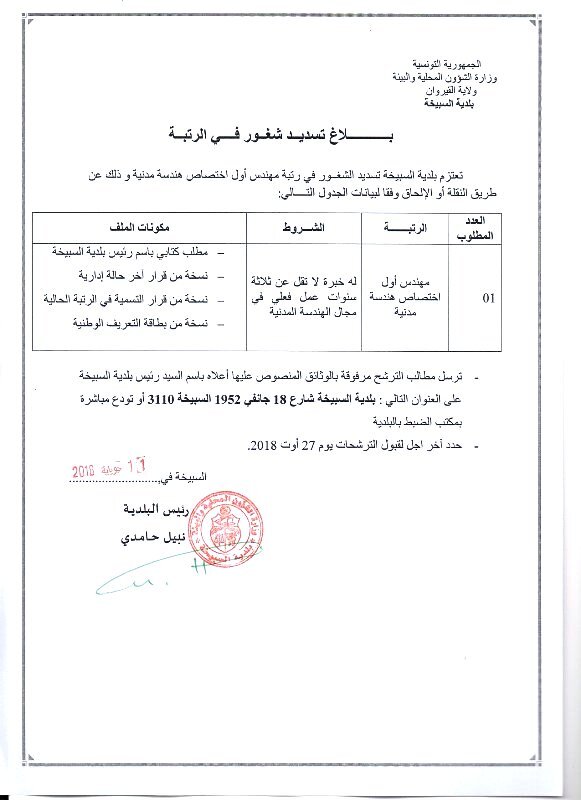 بلدية السبيخة: بلاغ انتداب مهندس . Annonces بلدية السبيخة: بلاغ حول تسديد شغور في رتبة مهندس أول إختصاص هندسة مدنية. Partager : Cliquez pour partager sur Facebook(ouvre dans une nouvelle fenêtre) Facebook Cliquez pour partager sur LinkedIn(ouvre dans une nouvelle fenêtre) LinkedIn Plus Cliquer pour partager sur X(ouvre dans une nouvelle fenêtre) X Cliquer pour envoyer un lien par e-mail à un ami(ouvre dans une nouvelle fenêtre) E-mail Cliquez pour partager sur WhatsApp(ouvre dans une nouvelle fenêtre) WhatsApp Facebook