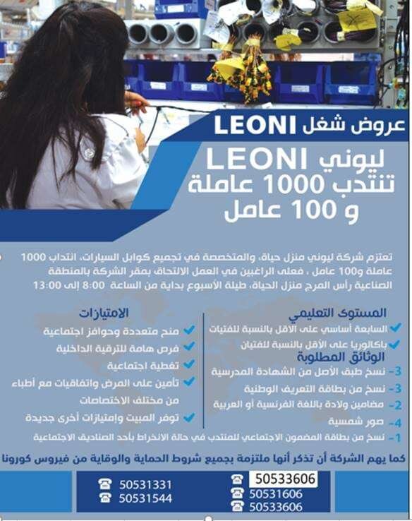 تعتزم شركة ليوني منزل حياة / انتداب 1000 عاملة و100 عامل