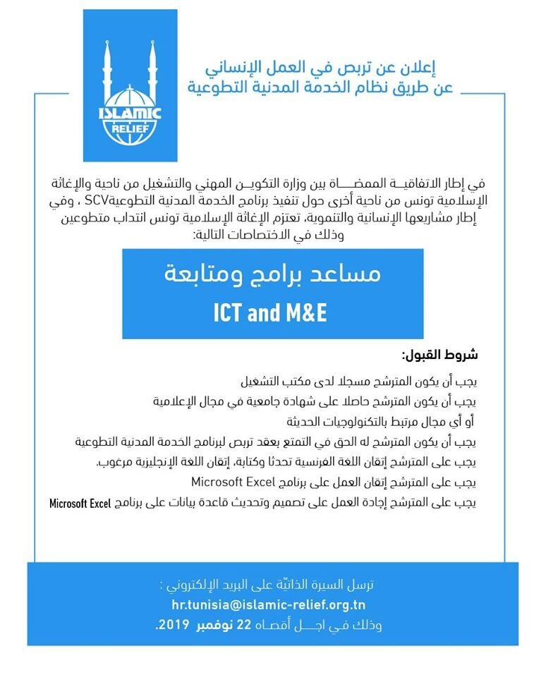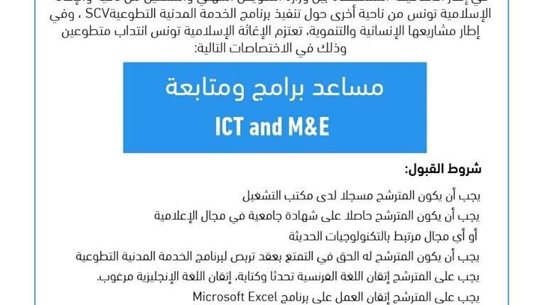في إطار الاتفاقيـــــة الممضــــــــــاة بين وزارة التكويـــــن المهني والتشغيل من ناحية والإغاثة الإسلامية تونس من ناحية أخرى حول تنفيذ برنامج الخدمة المدنية التطوعيةSCV، وفي إطار مشاريعها الإنسانية والتنموية، تعتزم الإغاثة الإسلامية تونس انتداب متطوعين وذلك في الاختصاص التالي: