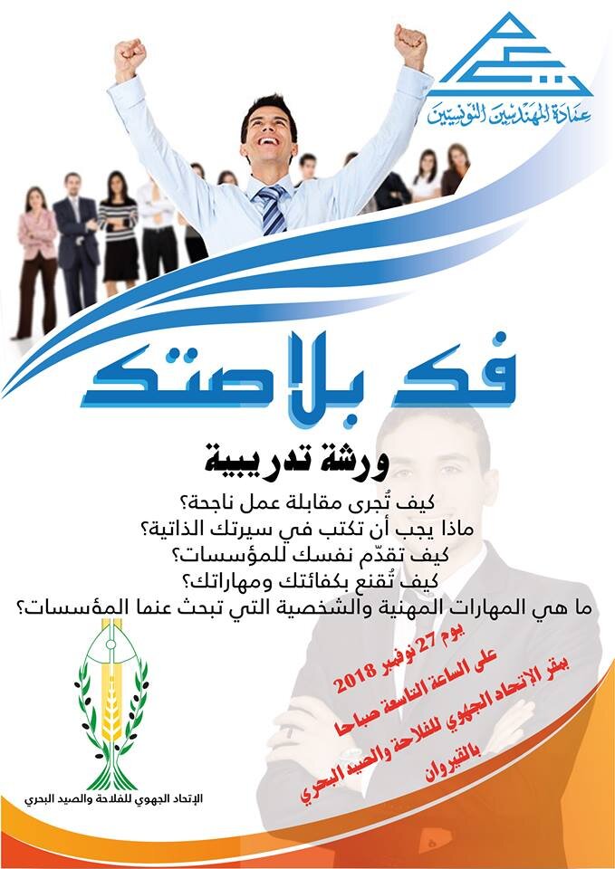 تنظم الهيئة الجهوية لعمادة المهندسين بالقيروان بالتعاون مع الاتحاد الجهوي للفلاحة و الصيد البحري ورشة تدريبية بقيادة المدرب والمستشار حسونة قيدارة في مجال تقنيات التواصل لحاملي الشهادات العليا و ذلك يوم الثلاثاء 27 نوفمبر 2018 على الساعة التاسعة صباحا بمقر الاتحاد الجهوي للفلاحة و الصيد البحري بالقيروان. لا تتخلّفوا عن موعد » فُك بلاصتك »
