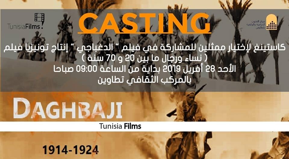 استعدادا لتصوير فيلم  » الدغباجي  » لشركة تونيزيا فيلم ، والذي سيتم تصوير جزء كبير من مشاهده بولاية تطاوين ، انتم على موعد يوم الأحد 28 أفريل 2019 بداية من الساعة 9:00 صباحا بفضاء المركب الثقافي تطاوين مع فريق إنتاج الفيلم للقيام بكاستينغ و إختيار ممثلين للمشاركة في تصوير الفيلم ( ذكور / إناث ) الأعمار ما بين 20 و 70 سنة.