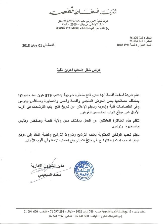 أصدرت شركة فسفاط قفصة اليوم الجمعة 1 جوان 2018 بلاغا تعلن فيه عن عزمها فتح مناظرة جديدة لانتداب 579 عونا من ولايات قفصة وقابس وصفاقس وتونس وذلك لسد حاجياتها ببعض الوحدات التابعة للشركة .