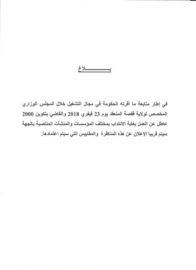 كما أصدرت بلاغا آخر تعلن فيه عن فتح مناظرة أخرى لتكوين ألفي عاطل عن العمل تنفيذا منها لقرارات المجلس الوزاري الأخير بالولاية بتاريخ 23 فيفري 2018.