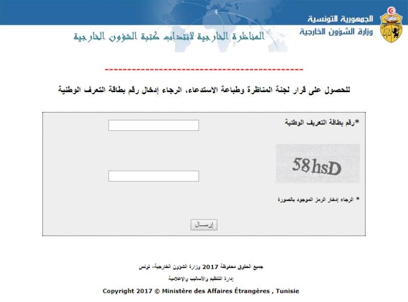 في إطار تقريب الخدمات الادارية وتسهيلا للإجراءات المتعلقة بتنظيم المناظرة الخارجية بالاختبارات لانتداب كتبة الشؤون الخارجية، تعلم وزارة الشؤون الخارجية أنه بإمكان المترشحين المقبولين لاجتياز اختبار الثقافة العامة الذي يعتمد تقنية الاسئلة متعددة الاختيارات والمقرر ليوم الاحد 17 سبتمبر 2017، سحب نسخة من الاستدعاء من موقع واب الوزارة على العنوان التالي: