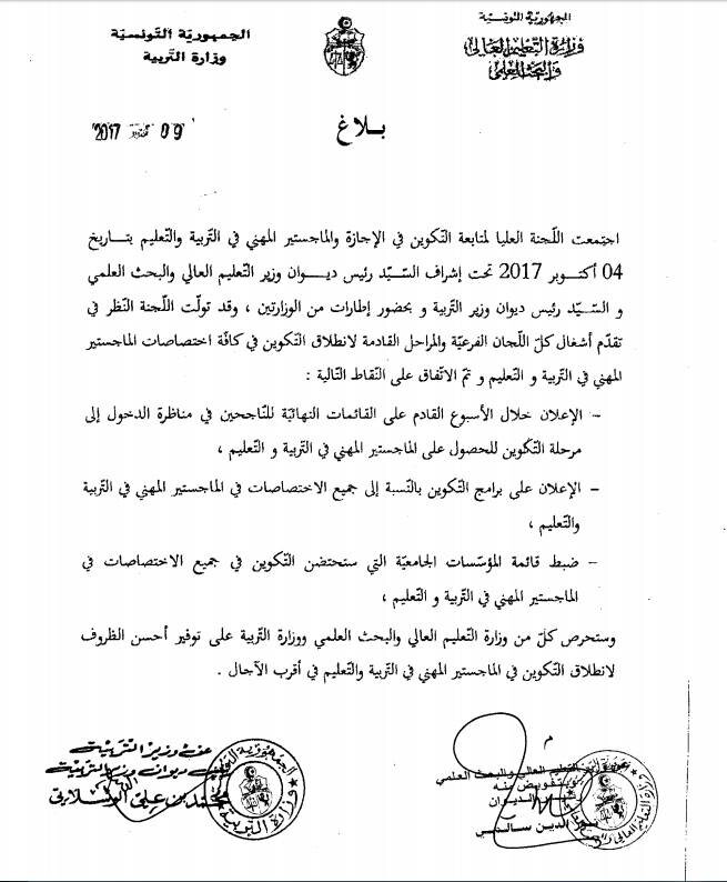 في بلاغ لها اليوم الاثنين، أفادت وزارة التربية أنّ لجنة تولت تقدم أشغال كل اللجان الفرعية والمراحل القادمة لانطلاق التكوين في كافة اختصاصات الماجستير المهني في التربية والتعليم وقد اتفقوا على النقاط الةاردة في البلاغ التالي: