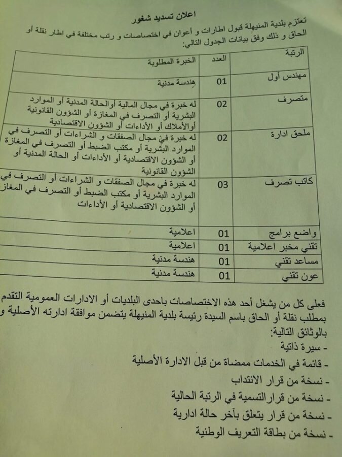 فعلى كل من يشتغل أخد الآختصاصات بإحدى البلديات أو الإدارات العمومية التقدم بمطلب نقلة أو إلحاق بآسم السيدة رئيسة بلدية المنيهلة ،يتضمن موافقة إدارته الأصلية ومرفقا بالوثائق التالية :