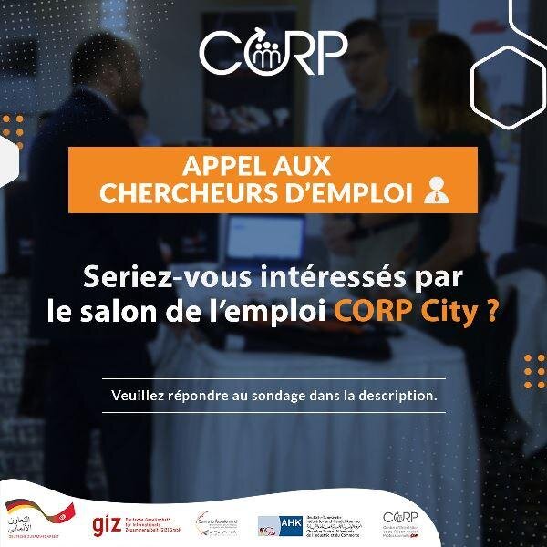 • Dans le cadre de nos programmes financés par la GIZ Tunisie à travers son Centre Tuniso-Allemand pour l’emploi, la migration et la réintégration, nous lançons un sondage afin de savoir si vous seriez intéressé par le Salon de l’emploi CORP City pour rencontrer différents offreurs d’emploi?