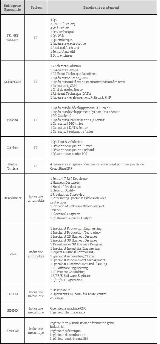 Pour sa deuxième édition qui se tiendra le 08 novembre 2024 à l’ENIT, le salon de l’emploi tant attendu “CORP Worky 2”, en partenariat avec l’Université Tunis EL Manar, accueillera 15 entreprises exposantes qui mettent à votre disposition près de 150 postes vacants pour les métiers suivants :