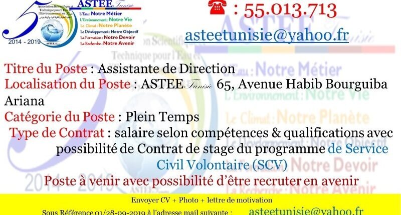 Read MoreTitre du Poste : Assistante de Direction Localisation du Poste : ASTEETunisie 65, Avenue Habib Bourguiba Ariana Catégorie du Poste : Plein Temps Type de Contrat : salaire selon compétences & qualifications avec…