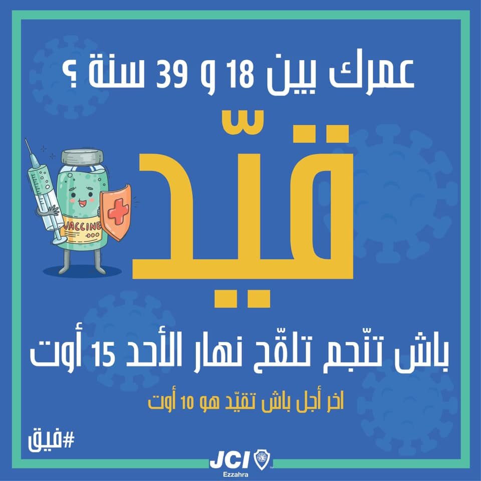 وسيخصص هذا اليوم للأشخاص الذين تتراوح أعمارهم بين 18 و39 سنة (المولودون بين 9 أوت 1981 و15 أوت 2003) والمسجلون بمنظومة evax إلى حدود 10 أوت 2021 بما فيهم الطلبة المسجلين بمنصة التلقيح المحدثة بوزارة التعليم العالي والبحث العلمي.