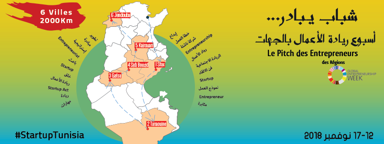 TPM organise la 4ème édition de la tournée Startup Tunisia dans les régions du 12 au 17 novembre à l’occasion de la semaine mondiale de l’entrepreneuriat. 60 porteurs d’idées seront en compétition pour pitcher leurs projets à :