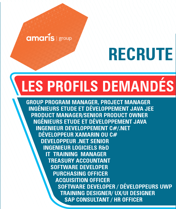 amaris // recrute Actualités, Annonces S’abonner à notre NEWSLETTER Recevoir tous les offres d'emploi ✅ Regarder la chaine à Recruter.TV Soyez à temps le 20 et le 21 février à la cité de la culture Av.Med V -Tunis! Rejoignez amaris sur notre stand S’abonner à notre NEWSLETTER Recevoir tous les offres d'emploi ✅ Regarder la chaine à Recruter.TV S’abonner à notre NEWSLETTER Recevoir tous les offres d'emploi ✅ Regarder la chaine à Recruter.TV Partager : Cliquez pour partager sur Facebook(ouvre dans une nouvelle fenêtre) Facebook Cliquez pour partager sur LinkedIn(ouvre dans une nouvelle fenêtre) LinkedIn Plus Cliquer pour partager sur X(ouvre dans une nouvelle fenêtre) X Cliquer pour envoyer un lien par e-mail à un ami(ouvre dans une nouvelle fenêtre) E-mail Cliquez pour partager sur WhatsApp(ouvre dans une nouvelle fenêtre) WhatsApp Facebook