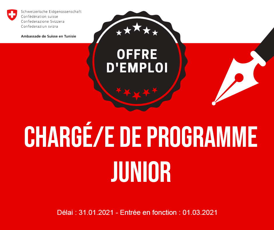 La section Coopération internationale de l’Ambassade de Suisse à Tunis recherche une personne proactive, qualifiée et professionnelle pour un poste de chargé/e de programme junior (100%), selon l’avis ci-dessous :