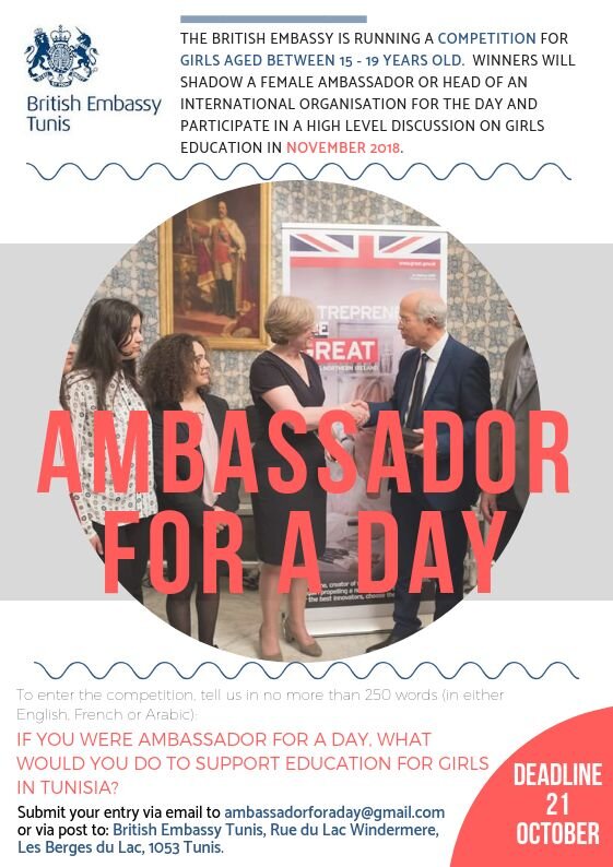 Pour offrir aux filles, a travers la Tunisie, l’occasion de découvrir ce qu’est la vie en tant qu’ambassadrice, nous nous associons à d’autres ambassades et organisations internationales pour donner aux filles la chance de devenir une «ambassadrice pour un jour» pendant le mois de Novembre 2018.