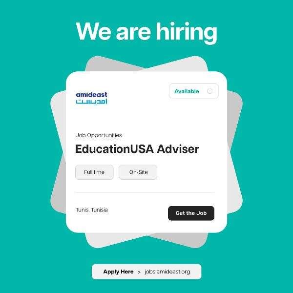 The EducationUSA Adviser (hereafter referred to as “adviser”) is part of the EducationUSA Tunisia office composed of two advisers responsible for providing EducationUSA (hereafter referred to as “EdUSA”) services and promoting higher education and study opportunities in the United States to audiences in Tunisia. Each adviser is primarily responsible for conducting outreach and advising in a specific geographic region within the country. This adviser position will be based at Amideast Tunis and work closely with American Corner Tunis. The adviser reports directly to Amideast’s Director of Programs and coordinates with representatives at the U.S. Embassy in Tunisia.