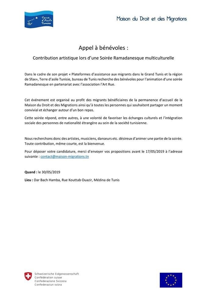 pour une contribution artistique lors d’une Soirée Ramadanesque multiculturelle qui aura lieu le 30/05 à la Médina de Tunis.
