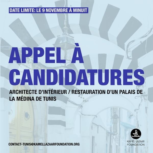 Dans le cadre d’un projet de restauration d’un Palais de la Médina de Tunis d’une superficie de 1500 m2, la Fondation Kamel Lazaar lance un appel à candidature pour la sélection d’un Architecte d’intérieur créatif ayant un intérêt pour des projets réaménagement et de mise en valeur des palais/maisons historiques.