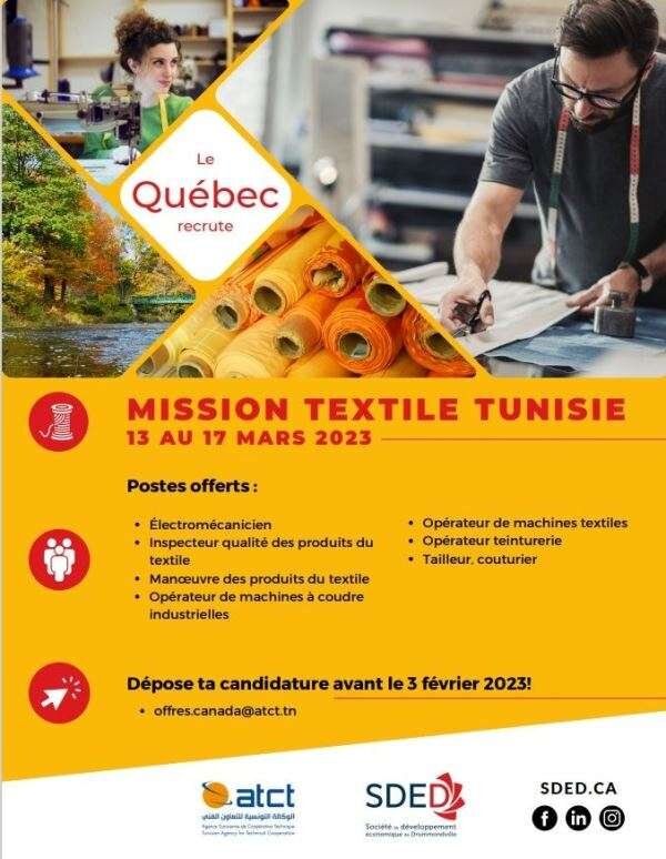 L’Agence Tunisienne de Coopération Technique (ATCT) en collaboration avec la Société de développement économique de Drummondville (SDED),organise une mission de recrutement en Tunisie
