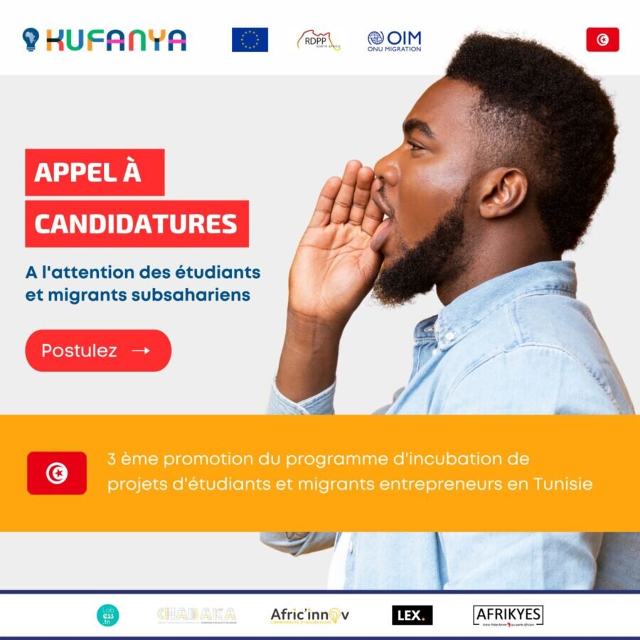 • Bénéficiez du programme d’incubation de Kufanya (incubateur social pour migrants entrepreneurs en Tunisie) et faites partis de la 3ème promotion d’étudiants et migrants entrepreneurs en Tunisie, qui vont bénéficier d’un accompagnement complet, pour la réalisation de leurs projets et la création de leurs entreprises en Tunisie.