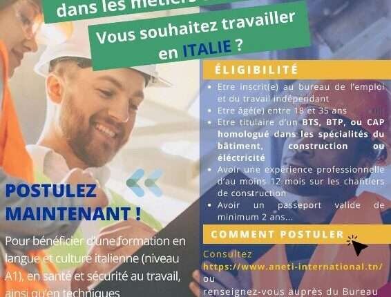 APPEL À CANDIDATURES POUR LE RECRUTEMENT DE JEUNES CHERCHEURS D’EMPLOI TUNISIEN(NE)S QUALIFIÉ(E)S DANS LES MÉTIERS DU BÂTIMENT POUR DES POSTES D’EMPLOI EN ITALIE MAÇON COFFREUR-BOISEUR POSEUR DE REVÊTEMENTS DURS I….