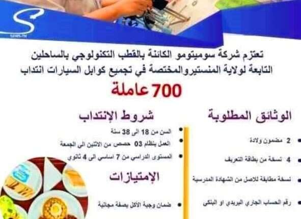 Read Moreتعتزم شركة سوميتومو اليابانيّة انتداب 700 عاملة. شروط الانتداب: * المستوى الدراسي: من 7 اساسي الى 4 ثانوي * العمر: من 18 الى 38 سنة * العمل بنظام 3 حصص…