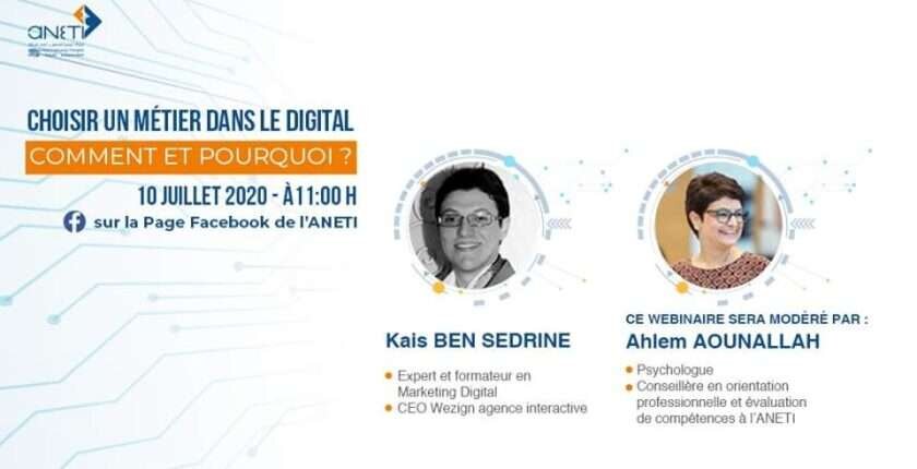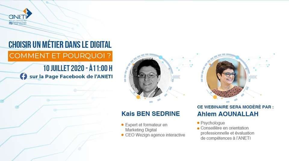 L’Agence Nationale pour l’Emploi et le Travail Indépendant ANETI a le plaisir de vous convier à un webinaire le vendredi 10/07/2020 à partir de 11h sur le thème : « Choisir un métier dans le digital : Comment et pourquoi ?».