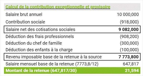 Ainsi, la base de cette contribution est différente de la base imposable. La contribution provisoire n’est pas déductible de l’assiette de l’impôt sur le revenu des personnes physiques.