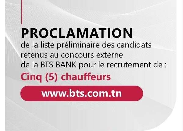 • تبعا للمناظرة الخارجية للبنك التونسي للتضامن لإنتداب 5 أعوان في خطة سائق (إعلان ثاني)، تم إعلان المترشحين الآتي ذكرهم ناجحين في المناظرة