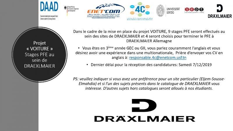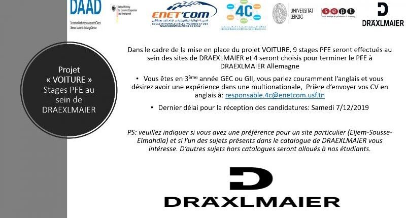 DRAXLMAIER / propose [des STAGES PFE 2020] Actualités, Stages / PFE Dans le cadre de la mise en place du projet VOITURE, 9 stage PFE sont proposés dans les sites de DRAXLMAIER. S’abonner à notre NEWSLETTER Recevoir tous les offres d'emploi ✅ Regarder la chaine à Recruter.TV Partager : Cliquez pour partager sur Facebook(ouvre dans une nouvelle fenêtre) Facebook Cliquez pour partager sur LinkedIn(ouvre dans une nouvelle fenêtre) LinkedIn Plus Cliquer pour partager sur X(ouvre dans une nouvelle fenêtre) X Cliquer pour envoyer un lien par e-mail à un ami(ouvre dans une nouvelle fenêtre) E-mail Cliquez pour partager sur WhatsApp(ouvre dans une nouvelle fenêtre) WhatsApp Facebook