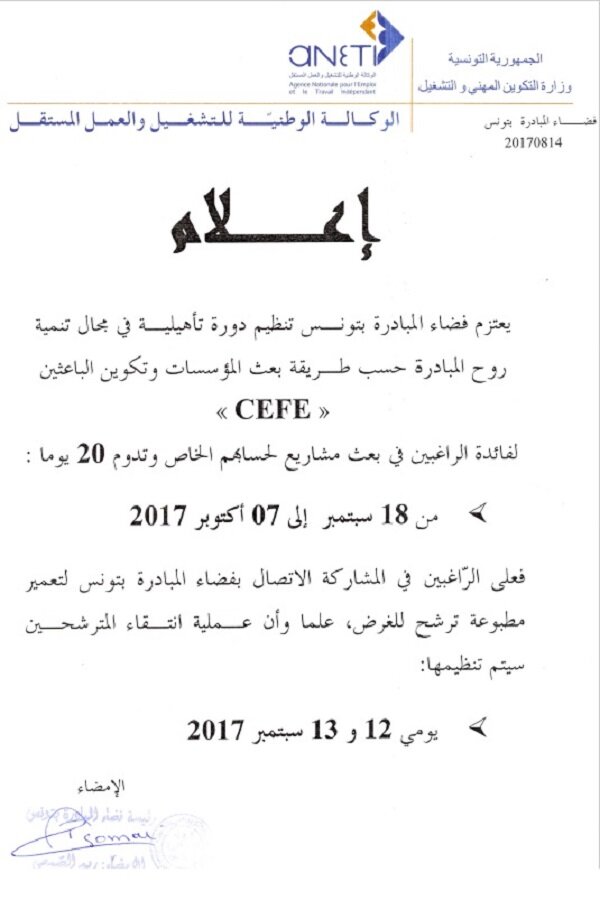 يعتزم فضاء المبادرة بتونس تنظيم دورة تأهيلية في مجال تنمية روح المبادرة حسب طريقة
