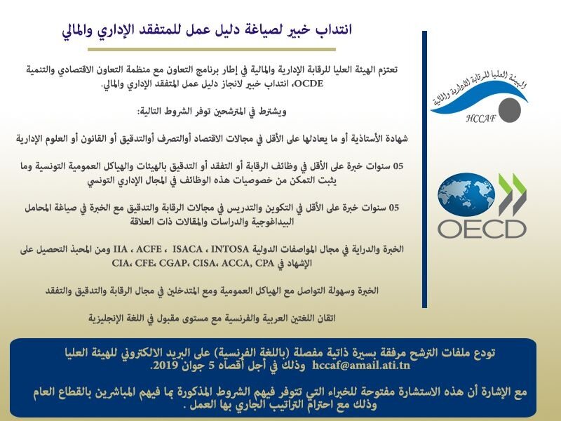 تعتزم الهيئة العليا للرقابة الإدارية والمالية في إطار برنامج التعاون مع منظمة التعاون الاقتصادي والتنمية OCDE، انتداب خبير لانجاز دليل عمل المتفقد الإداري والمالي.