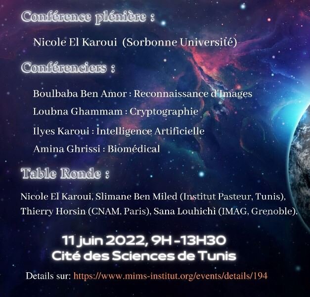 •  la derniere partie de la journée sera reservée pour une table ronde animée par Nicole El Karoui, Slimane Ben Miled (Directeur laboratoire BIMS Bio-Informatics, Institut Pasteur), Sana Louhichi (Université de Grenoble, Responsable Master-Pro), Thierry Horsin (CNAM et ancien Président de la SMAI).