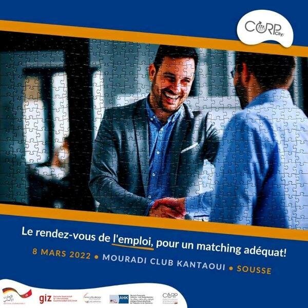 Un salon de l’emploi inversé réunissant recruteurs et chercheurs d’emploi pour un matching adéquat ! Précédée par deux éditions qui ont fait preuve de succès, nous sommes heureux de vous annoncer le lancement de la troisième édition du CORP City qui aura lieu le 8 mars 2022 en mode hybride à El Mouradi club Kantaoui en présentiel et sur la plateforme digitale en virtuel.