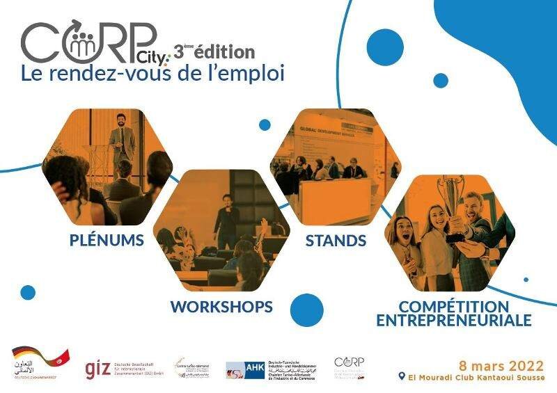 Un salon de l’emploi inversé réunissant recruteurs et chercheurs d’emploi pour un matching adéquat ! Précédée par deux éditions qui ont fait preuve de succès, nous sommes heureux de vous annoncer le lancement de la troisième édition du CORP City qui aura lieu le 8 mars 2022 en mode hybride à El Mouradi club Kantaoui en présentiel et sur la plateforme digitale en virtuel.