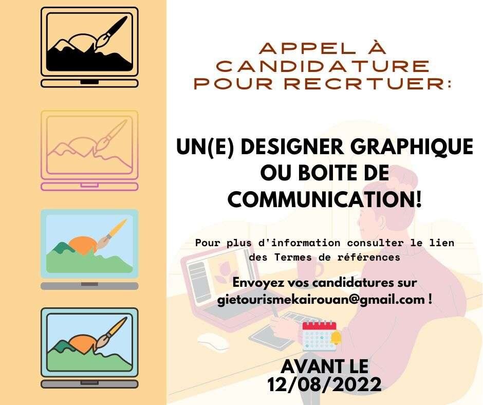 Dans le cadre de son travail continu pour l’appui et l’accompagnement du Groupement à intérêt économique (Groupement du tourisme Alternatif à Kairouan) créé par un groupe des entrepreneurs et prestataires des services à Kairouan avec l’appui de l’UNFTK et l’association Initiative Kairouan, nous lançonsun appel à candidature pour le recrutementd’un(e) designer graphique