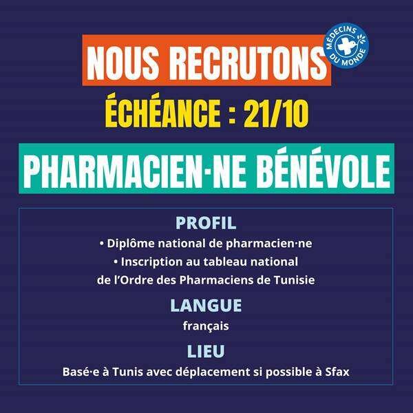 Appui technique du cycle de gestion des produits pharmaceutiques, dont l’approvisionnement des produits Pharmaceutiques. Aide à définir et diffuser les cadres et outils de développement de la qualité des pratiques  pharmaceutiques. Appui la gestion et le suivi du stock de médicaments au niveau des trois bases sur la base des  guidelines de Médecins du Monde Belgique en Tunisie.